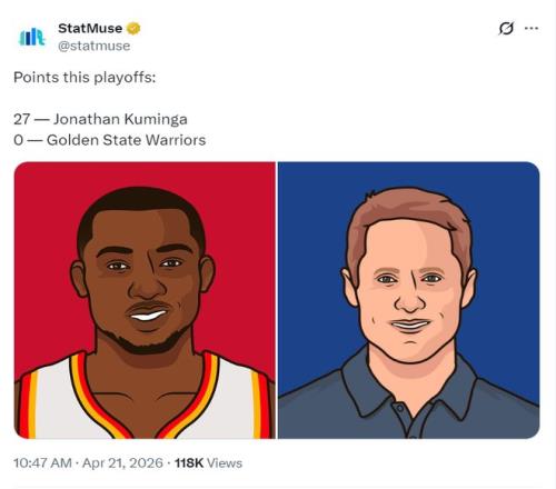 赛后美媒SataMuse晒出,库明加季后赛已经27分对比勇士0分的数据扎心科尔。