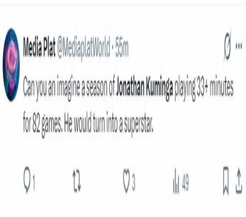 美媒MP还透露,你能想象如果库明加能出战82场比赛且场均至少33分钟吗?那样他有希望成为球星。