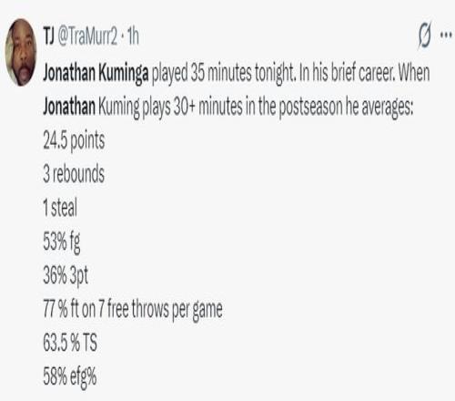 库明加季后赛换算场均35分钟,那他场均能贡献24.5分3篮板1抢断,命中率53%,三分命中率36%。