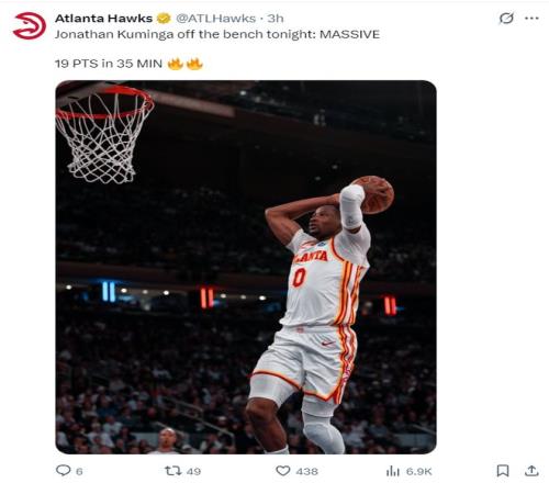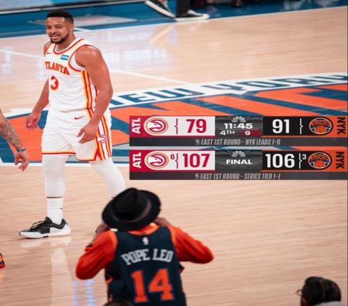 北京时间4月21日,NBA季后赛,老鹰107-106险胜尼克斯,大比分扳成1-1,东部第六的老鹰在麦迪逊广场花园球馆的吵杂声中夺走了一场胜利。这场比赛麦科勒姆两罚不中让人捏了一把汗,好在大桥反绝杀打铁。赛后老鹰官方让乔纳森-库明加登上了赢球海报。