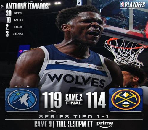 森林狼19分逆转掘金,扳平大比分