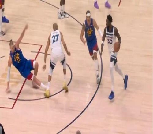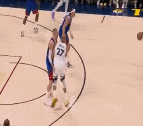 约基奇一个体重128kg的大中锋,与戈贝尔轻轻对抗后就摔倒在地,后者被吹进攻犯规。