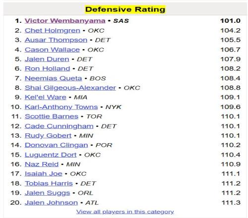 高阶数据方面,BBR所统计的防守BPM、防守效率,文班亚马全都是第一,其中防守效率榜上,前三恰好是今年的DPOY前三(这个数据的准确性其实一般)。