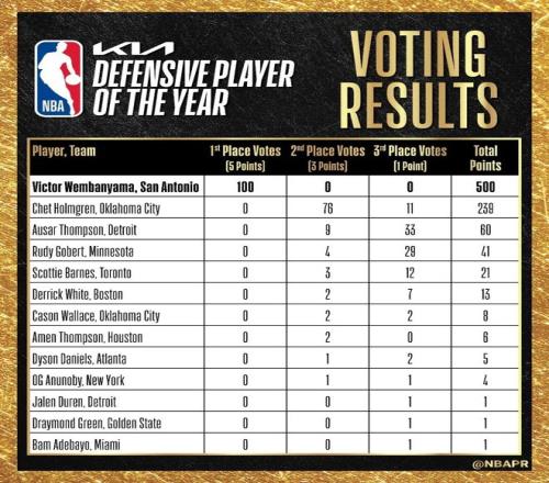 来自NBA官方的最新消息,本赛季年度最佳防守球员(DPOY)正式公布,马刺球星文班亚马当选,荣膺奥拉朱旺奖(DPOY奖的名字)。