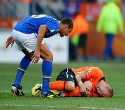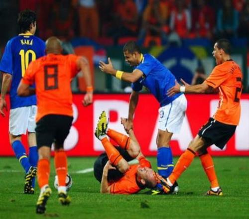 如果说这只是意外,那接下来的操作,就是纯粹的愚蠢了。当巴西被斯内德反超比分后,球队急需追平。这时候,作为后场核心的梅洛,本应冷静下来组织防守,策动反击。可他干了什么?在一次毫无必要的拼抢中倒地后,他竟然故意踩踏已经倒地的罗本!