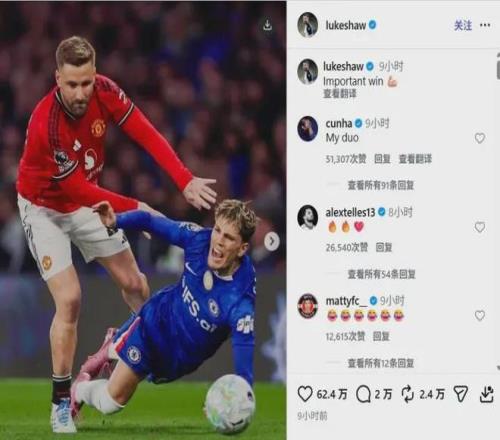 终场哨响后,没有一位曼联球员与加纳乔握手。更劲爆的是,卢克·肖在Instagram上发布了一张自己将加纳乔推倒在地的照片,并配文“重要的胜利”。曼联队长布鲁诺·费尔南德斯随即评论了一个写着“That‘s a violation”的GIF动图。这条动态7小时内就获得了7.7万次点赞。