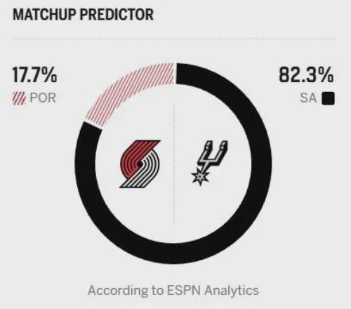 即将到来的G2,马刺胜率高达82.3%,开拓者胜率则低至17.7%。