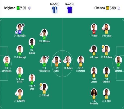 切尔西首发:1-桑切斯、3-库库雷利亚、21-哈托、23-查洛巴、27-古斯托(90' 34-阿昌庞)、29-福法纳(46' 49-加纳乔)、8-恩佐、25-凯塞多、45-拉维亚(73' 14-埃苏戈)、7-内托、9-德拉普(72' 38-吉乌)