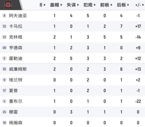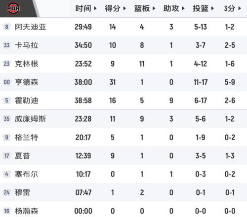 本场开拓者10人获得出场机会,没有杨瀚森。亨德森独得31分,霍勒迪16分5板9助,罗威11分9板4助,克林根9分10板。塞布尔10分钟的出场时间,3中0,正负值负-22,是开拓者最大短板,还不如让杨瀚森上场锻炼一下。目前看杨瀚森的NBA第一个赛季基本结束了,因为小杨根本不在斯普利特的季后赛战术计划之内。