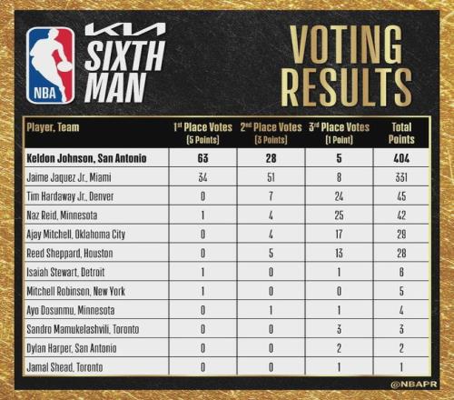 北京时间4月23日上午,NBA官方宣布,马刺球员凯尔登-约翰逊当选本赛季常规赛最佳第六人。凯尔登-约翰逊拿到63张第一选票,28张第二选票和5张第三选票,总得分404分高居第一。热火球员哈克斯第二,掘金球员小哈达威第三。