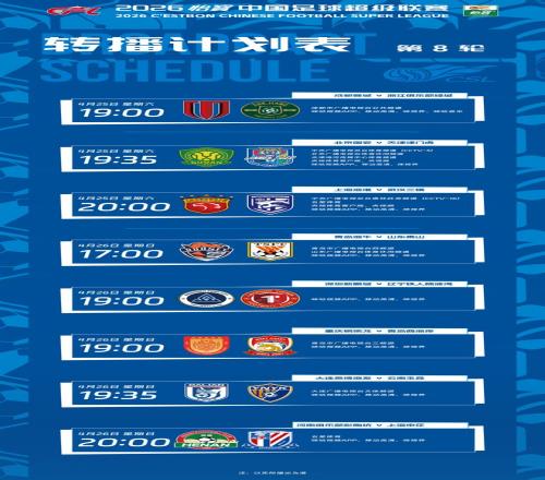 一周双赛,紧锣密鼓!4月25日、26日,2026赛季中超联赛将展开第8轮较量。根据转播计划,本轮8场比赛都有网络直播,7场还有电视平台直播。央视体育频道(CCTV5)、奥林匹克频道(CCTV16)也将直播2场。