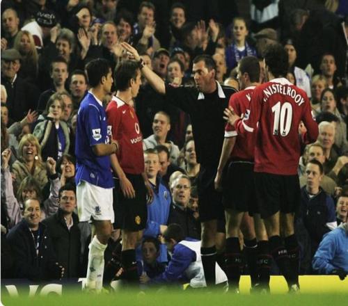 2005年对阵埃弗顿的比赛中,加里-内维尔因将皮球踢向古迪逊公园主场看台被罚下,随后在安保护送下离场。