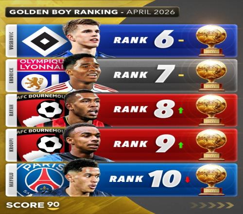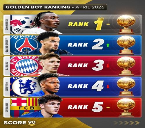 体育播报04月24日宣 Score90给出了2026年金童奖4月份最新排名预测,迪奥曼德居首,埃梅里第二,卡尔第三。