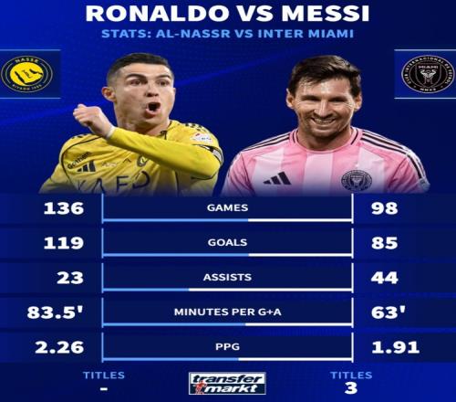 C罗在利雅得136场119球23助攻,梅西在迈阿密98场85球44助攻