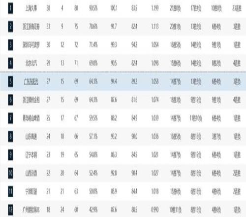 5.广东东阳光 27胜15负
