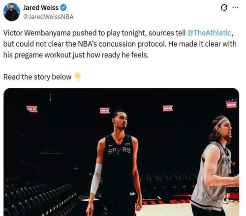 马刺队记Jared Weiss也同样送来好消息,透露文班本想出战G3,并且在赛前热身时一再表示自己已经做好准备,可惜未能通过脑震荡保护协议。