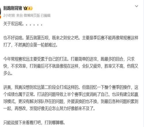 今年常规赛宏远主要受累于自己的打法。打最简单的进攻,跑最多的回合,只求快,不求效率,打到最后可不就是像现在这样,全队又疲劳,胜率又不高,伤病又那么多。打法的问题导致上半个赛季过度消耗了自己,也没有建立起赢球模式,更没有解决球队存在的问题,外援该换的也不换,到最后各种问题积累到一起,再想改,发现好像无论怎么努力好像都来不及了。