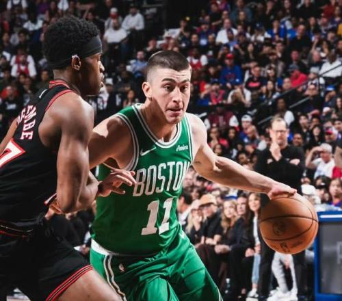 本场比赛,双方在首发阵容上面,76人这边派出的是,马克西,乔治,乌布雷,博纳,埃奇库姆。凯尔特人这边派出的是,塔图姆,布朗,怀特,豪瑟和克塔。首节比赛开始,凯尔特人率先拿到球权,布朗节奏变换上篮得手,打进本场比赛首个进球,埃奇库姆闪电突破飞身抛投也为76人开张,乌布雷的底角三分开火一击命中,博纳篮下强起,自投自抢补扣得手,普理查德的定点三分开火一箭穿心,马克西不甘示弱,追身大号三分立马回应一球,布朗的正面干拔三分球同样也进。马克西借助掩护,电光火石上篮挑落两分,武切维奇的侧翼三分发炮空心入网。