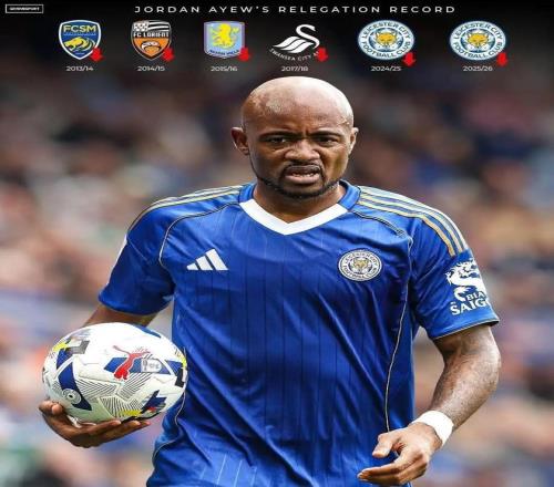莱斯特城已经确定从英冠联赛降级,而这是队内前锋乔丹-阿尤个人职业生涯的第6次随队降级了。