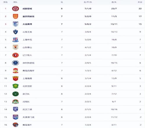 在积分榜上,成都蓉城以22分高居榜首,战绩是7胜1平,保持不败。重庆铜梁龙17分,排名第2,比成都蓉城少赛一场。大连英博以15分排名第3。第4的是云南玉昆,拿到9分。上海申花、山东泰山和辽宁铁人都是7分。上海海港赢球之后,总积分达到5分,升到第10名。而输球的北京国安只有3分,排名第11。浙江队也是3分,排名第12。