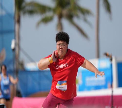 沙滩田径赛场上,中国选手宋佳媛成为女子铅球冠军,这是中国体育代表团在本届亚沙会沙滩田径项目中收获的首枚金牌。宋佳媛在最后一投中投出19米15,夺冠的同时也刷新了赛会纪录。