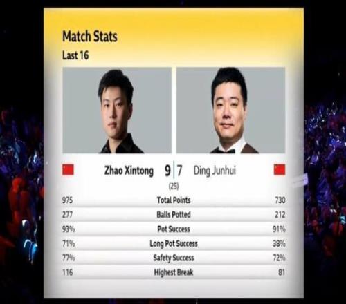 2026斯诺克世锦赛16进8轮次,第二阶段赵心童打出一杆破百(115)和三杆50+(77、59、87),丁俊晖打出两杆50+(69、69)。第二阶段开始后双方各胜一局,随后赵心童连胜三局,第十四局丁俊晖打出单杆69分获胜,第十五局赵心童获胜,第十六局丁俊晖打出单杆69分扳回一局。第二阶段战罢,赵心童以9比7的比分暂时领先丁俊晖;第三阶段将于4月26日17点开始。