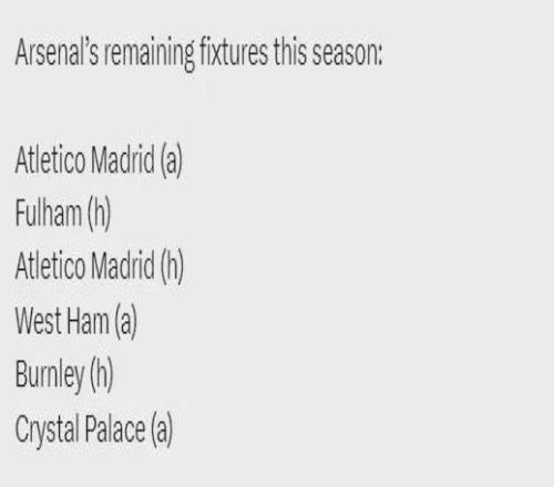 阿森纳本赛季剩余比赛:客战马竞、主战富勒姆、主战马竞、客战西汉姆、主战伯恩利、客战水晶宫