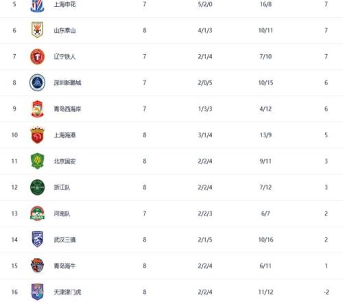 前7轮之后,北京国安(3分)、武汉三镇(2分)积分转正,青岛海牛(-2分)、天津津门虎(-5分)分别排名后两位,也成为仅有的两支尚未清零的球队。
