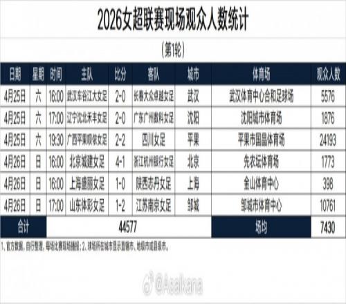 体育播报4月26日宣 2026赛季女超联赛首轮全部比赛于今天下午结束,据德转中国区管理员朱艺统计,首轮女超6场比赛共44577名观众现场观战,创下历史纪录。