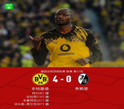北京时间4月26日德国足球顶级联赛第31轮,多特蒙德主场对阵弗赖堡。上半场,本塞拜尼长传,拜尔破门。布兰特传中,吉拉西建功。瑞尔森开出角球,本塞拜尼头槌得分。下半场,法比奥-席尔瓦破门。全场比赛结束,多特4-0轻取弗赖堡,结束两连败。