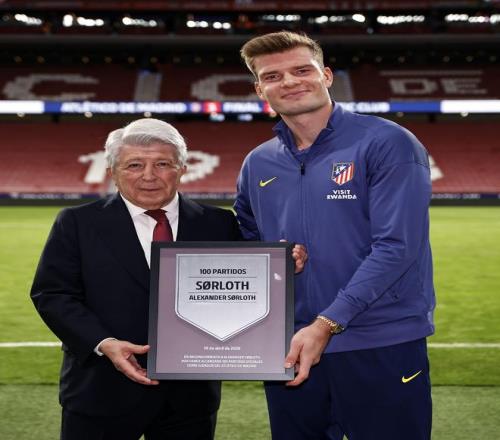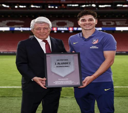 马竞官方写道:“征途国际 的主席恩里克-塞雷佐,为胡利安-阿尔瓦雷斯与亚历山大-瑟洛特分别颁发了纪念铭牌,二人都已身披红白战袍为马竞出战满100场正式比赛。”