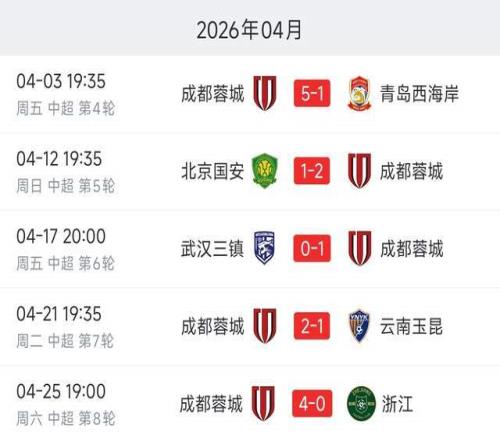 中超4月赛程结束:成都蓉城5连胜狂轰14球,堪比当年恒大!