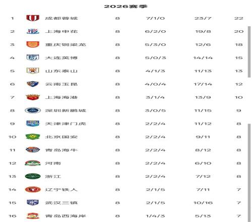 2026赛季中超联赛第8轮比赛已于上周末顺利进行,最新的无罚分版积分榜中,上海申花落后榜首成都蓉城2分,3支球队同积7分垫底。之所以要写无罚分版的积分榜,是因为这个榜单更能真实地反映出各支球队目前的状态。