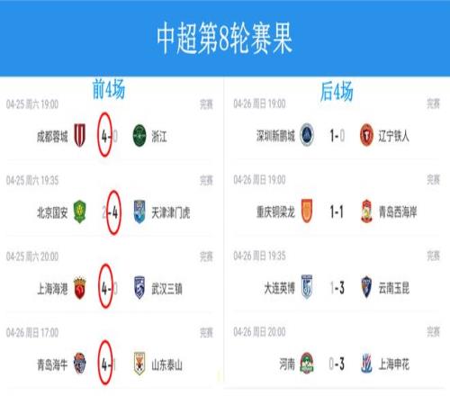中超第8轮意外频发——黑马不黑、强弱不明、兄弟操戈,及时雨+送温暖。或许,这就是中超的魅力!你想要的,你想看到的足球元素,它都一一呈现。很巧合的是,本轮中超幸运数字4大行其道:前4场比赛,赢球的一方不约而同地各进4球,一个不多一粒不少;再看后4场,各队要么最多进1球,要么3球,1+3还是等于4(下图)。这种不正常的现象只能用玄学来解释!