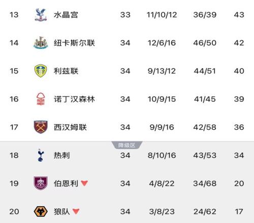 而在保级大战中,上赛季就已经颓势明显的曾经的英超big6球队之一的热刺队本赛季就没有这么好运了,如今排在联赛第18名的它们落后最直接保级竞争对手的西汉姆联队2分,在联赛还剩下4轮的情况之下保级形势岌岌可危。这支英超联赛成立34年以来从未降级的准豪门球队本赛季很可能就要陷入绝境了!