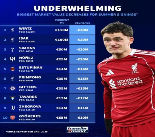 去年夏窗新援身价下跌榜:维尔茨3000万欧居首,伊萨克2000万欧