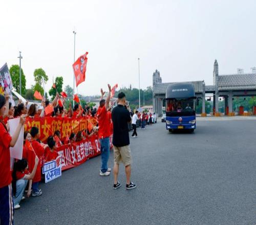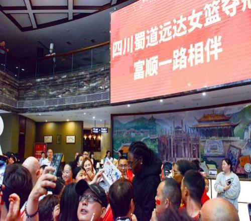 四川女篮将士们乘坐大巴抵达的后,迎接队伍的人群敲锣打鼓,还有人在舞狮庆祝。教练组和队员代表们走下大巴,现场的球迷齐声喝彩。四川女篮主教练迪萨尔一边挥舞小红旗,一边用手机录制视频。