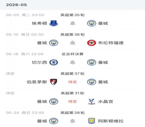 曼城第37轮对阵伯恩茅斯和第31轮对阵水晶宫的赛程仍待定,这两场比赛将分别落在5月16日对阵切尔西的足总杯决赛前后。