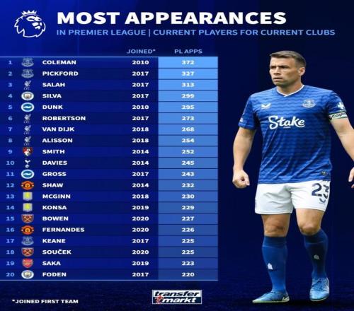 北京时间4月29日,德转列出了英超球员在现俱乐部中联赛出场数排名,埃弗顿老将科尔曼以372场高居第一,萨拉赫、伯纳多-席尔瓦、范戴克、布鲁诺-费尔南德斯以及萨卡上榜。