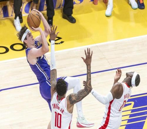 肯纳德这点被锁死了,今天4中0,得到2分3篮板2助攻,斯玛特3分7助攻3,得到11分6篮板,两大外线陷入低迷,湖人在外线陷入挣扎,只能靠詹姆斯强攻、里夫斯造犯规拿分,这样的打法让詹姆斯累瘫了!球队缺少进攻点,他只能持球强攻,这对于41岁的老詹来说,确实耗费体能,全场比赛詹姆斯18中9,3分4中0,罚球10中7,得到25分7助攻3篮板2抢断。里夫斯替补席作战,手感一般,15投4中,罚球13中13,得到22分4篮板6助攻。艾顿今天表现可以14中9,拿到18分17篮板。现在湖人的问题就是,他们的外线失准了,老将们的体能备受考验,火箭则渐渐找回手感。