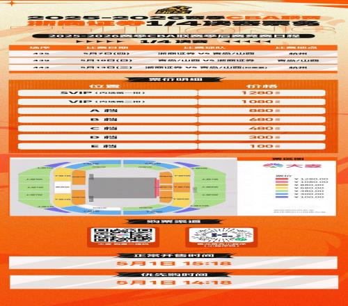 具体价格及票区详见下方海报,5月7日,期待在主场见到大家,全新的季后赛征程,让征途国际 一起为浙而战!